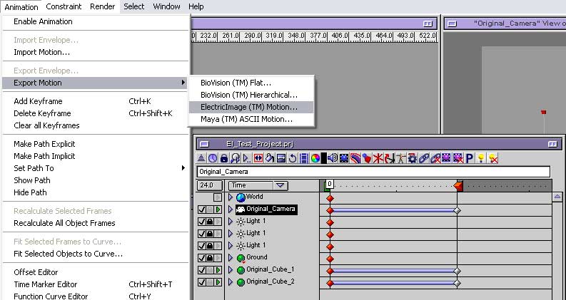 2. Select your camera and go to the Animation Menu and export your motion as ElectricImage Motion (OBM).