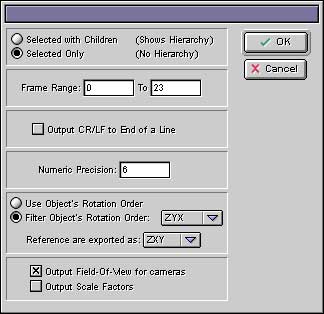 Also select the Object Rotation order to be "ZYX". Leave the reference order the same. To include the field of view information, check the "Output Field-Of-View for cameras" checkbox. Then click OK.