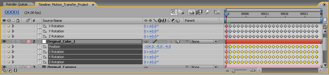 11. Select your cube1 and cube 2 solids and press U, and then U fast. This shows what has been keyed. Copy those channels, then paste them to the Cube1 and Cube2 nulls that were already create for you.